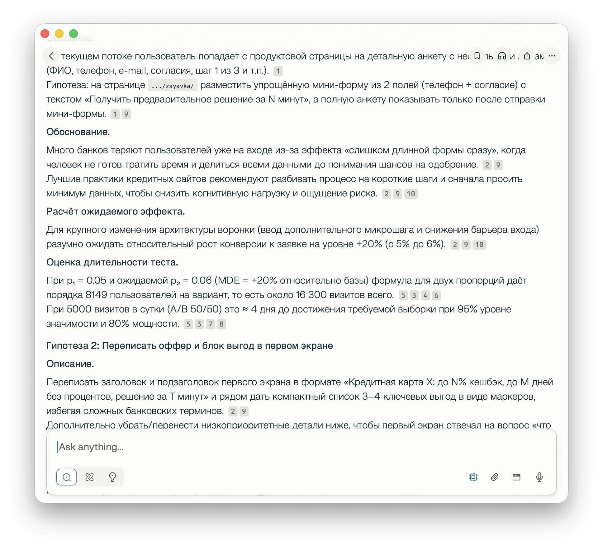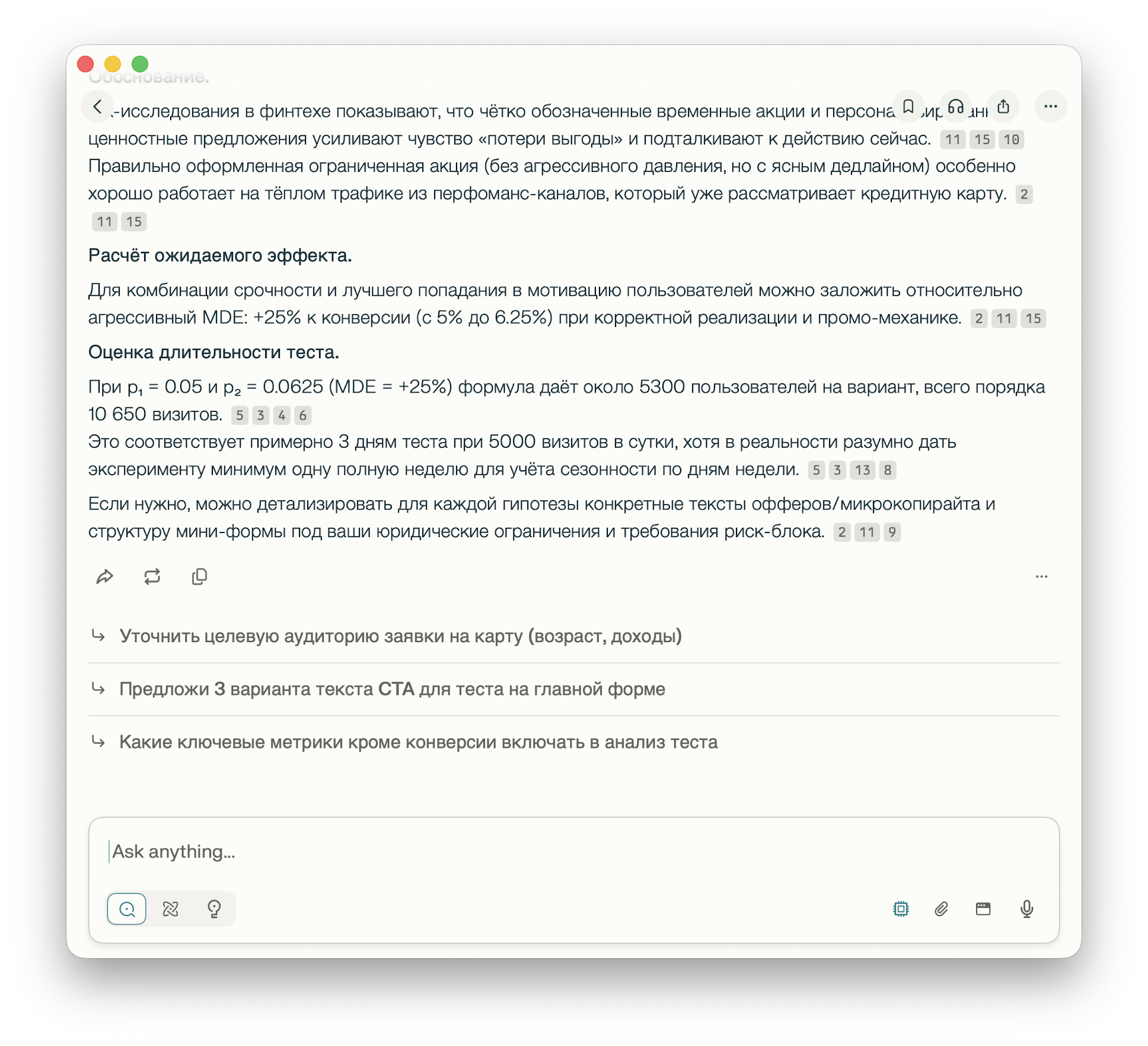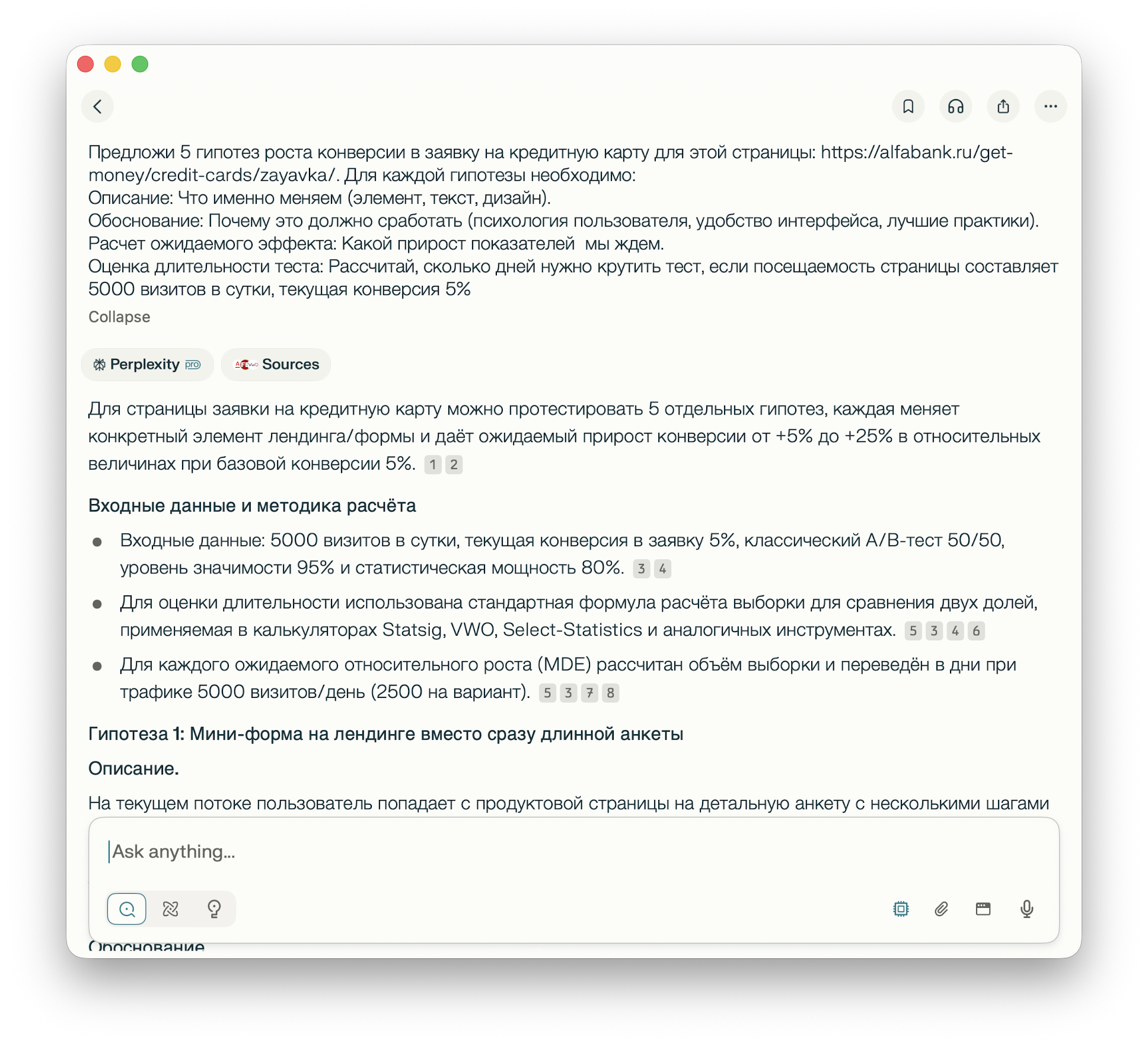 Используйте Perplexity как генератор черновиков. Он поможет вам заполнить план экспериментов за 5 минут вместо 5 часов. Ваша задача как эксперта — отфильтровать бред, пересчитать цифры, настроить аналитику и запустить качественный тест.