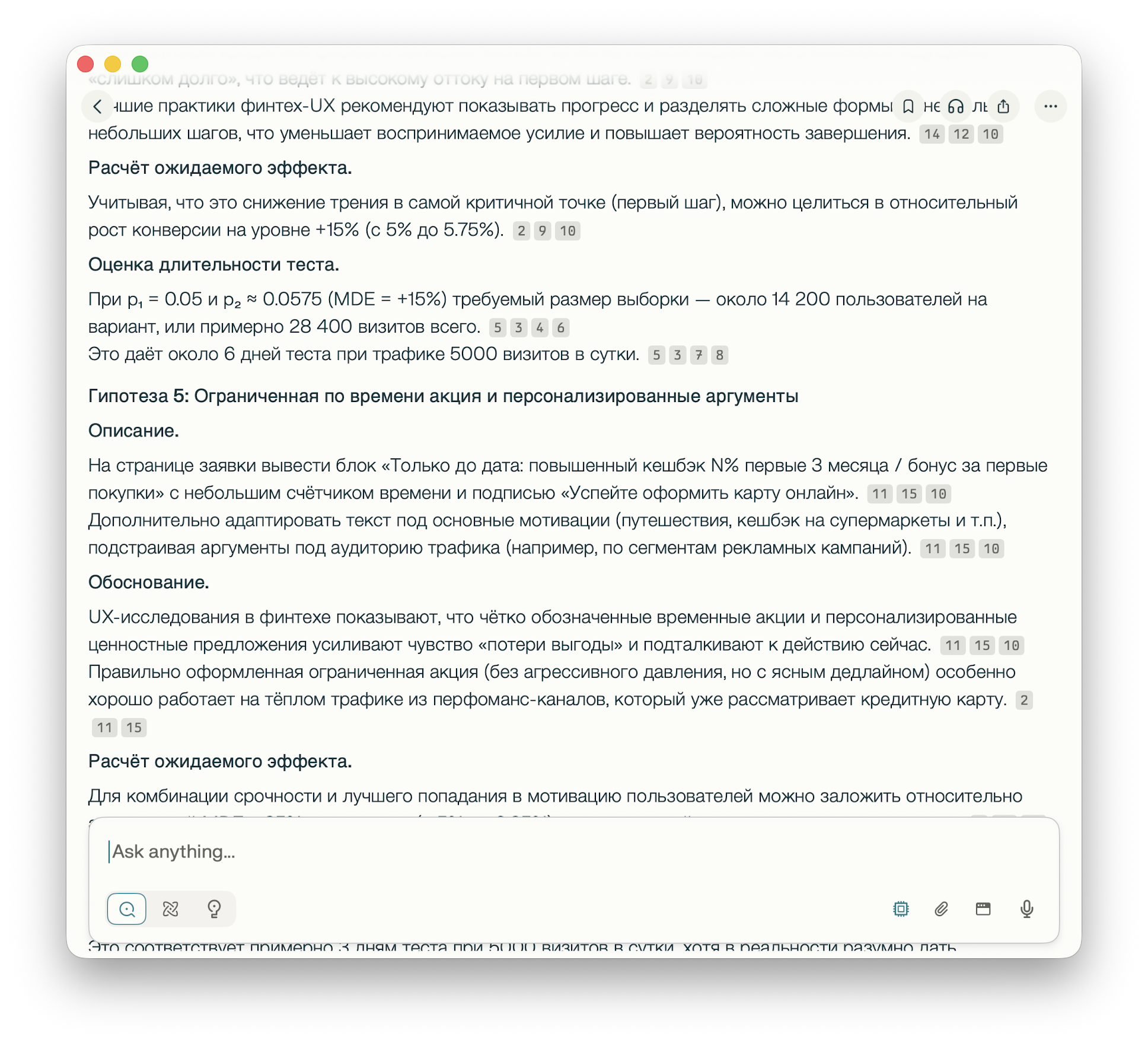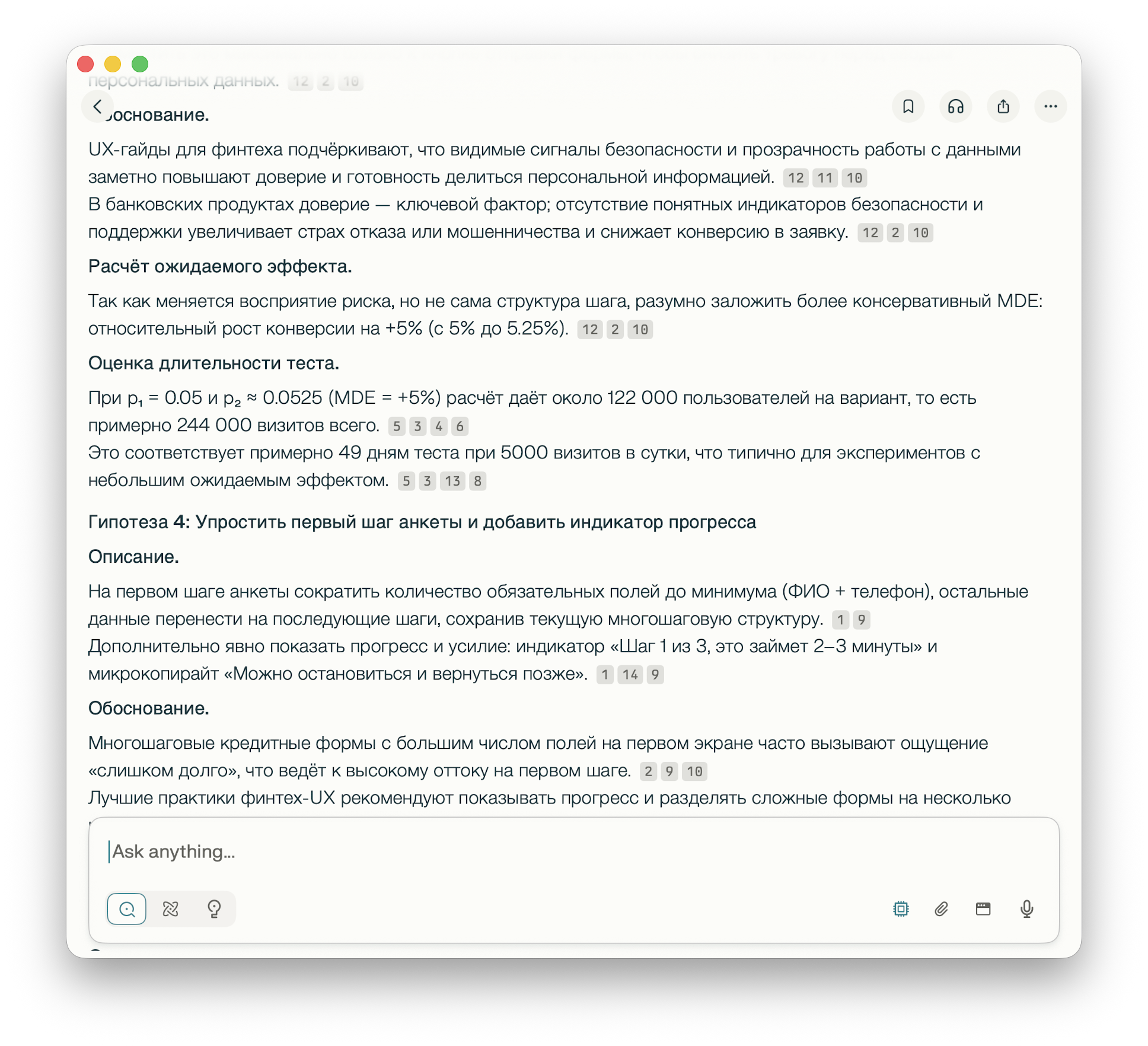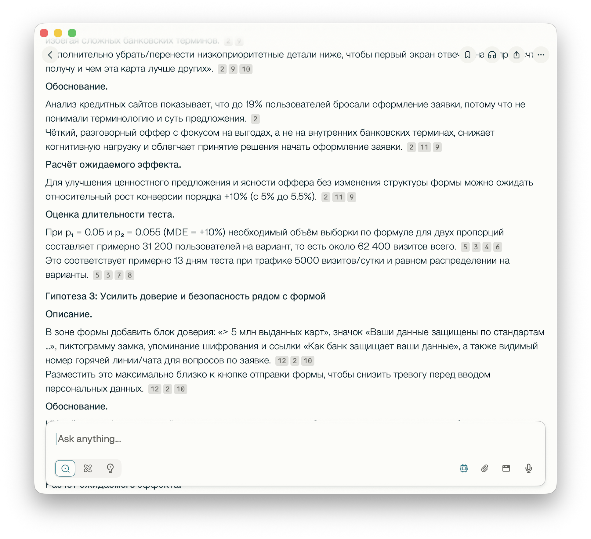 Используйте Perplexity как генератор черновиков. Он поможет вам заполнить план экспериментов за 5 минут вместо 5 часов. Ваша задача как эксперта — отфильтровать бред, пересчитать цифры, настроить аналитику и запустить качественный тест.